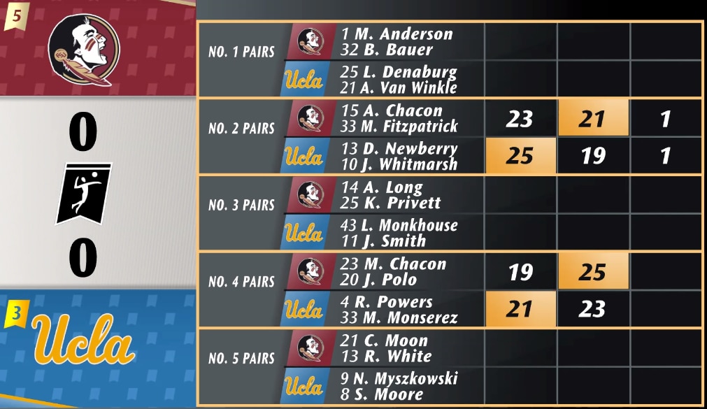 It all comes down to the match between the No. 1 pairs in the third set. FSU's Maddie Anderson and Brooke Bauer won the first set 21-16, but UCLA's Lexi Denaburg and Abby Van Winkle won the second set on their third set-point opportunity. The two pairs will play to 15 to decide a winner