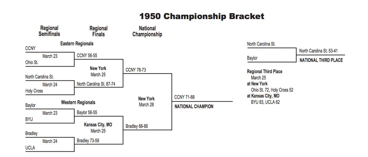 The 1950 NCAA tournament finished with CCNY defeating Bradley in the final, 71-68. With the victory, CCNY became the only team to win the postseason NIT and the NCAA tournament in the same year.