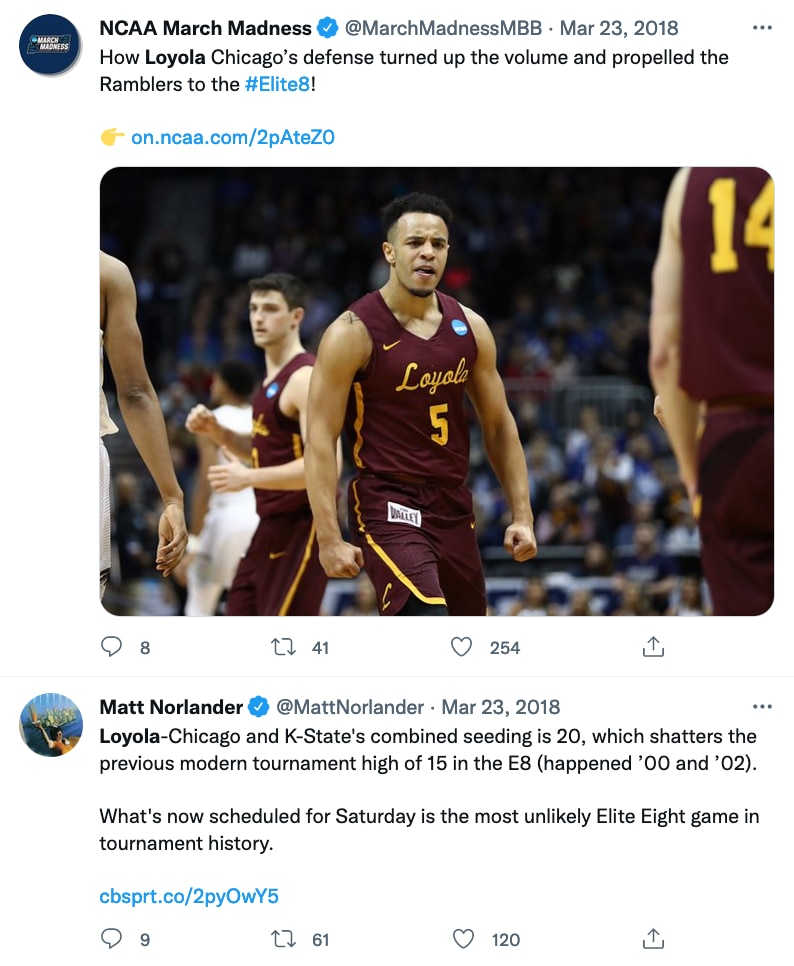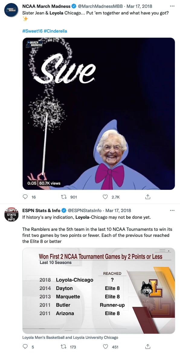 Forty-five years after winning its first and only Division I men's basketball national championship – and with a soon-to-be celebrity nun who became a household name overnight – Loyola Chicago made a Cinderella run to the Final Four in 2018, thanks to three consecutive late-game, game-winning jump shots that propelled the 11th-seeded Ramblers to the sport's final weekend.