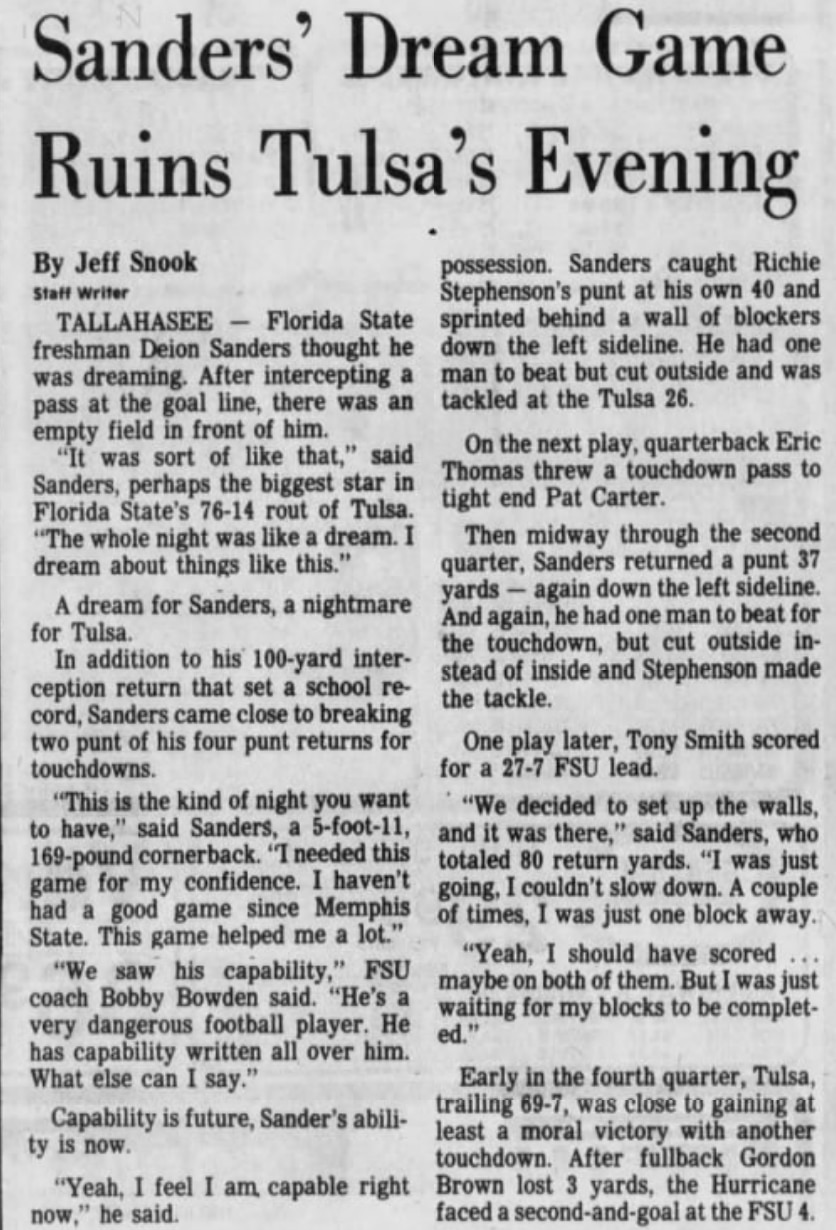 "Deion Sanders started things rolling 3.5 minutes into the second half with a 76-yard punt return for a touchdown to tie the score, 14-14, and give the Seminoles some much-needed momentum," reported The Orlando Sentinel. "'I looked at the Clemson sideline, and I said, 'This one is going back,' Sanders said. 'That punt return team really has a lot of pride. They wanted me to get into the end zone badder than I did.'"