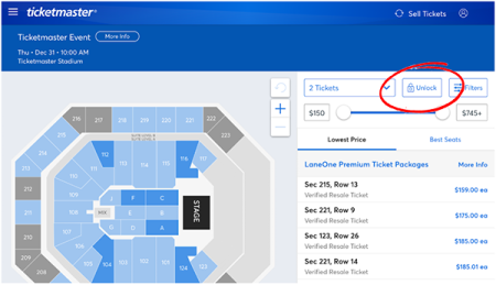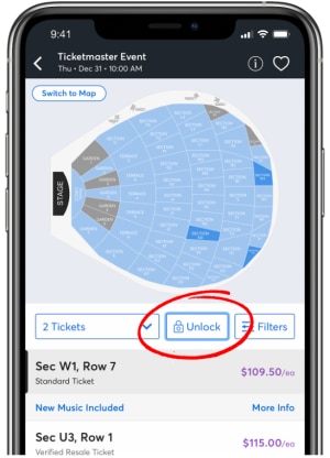 3. Select the Unlock button next to the Filters button and enter your code to see the available seats.