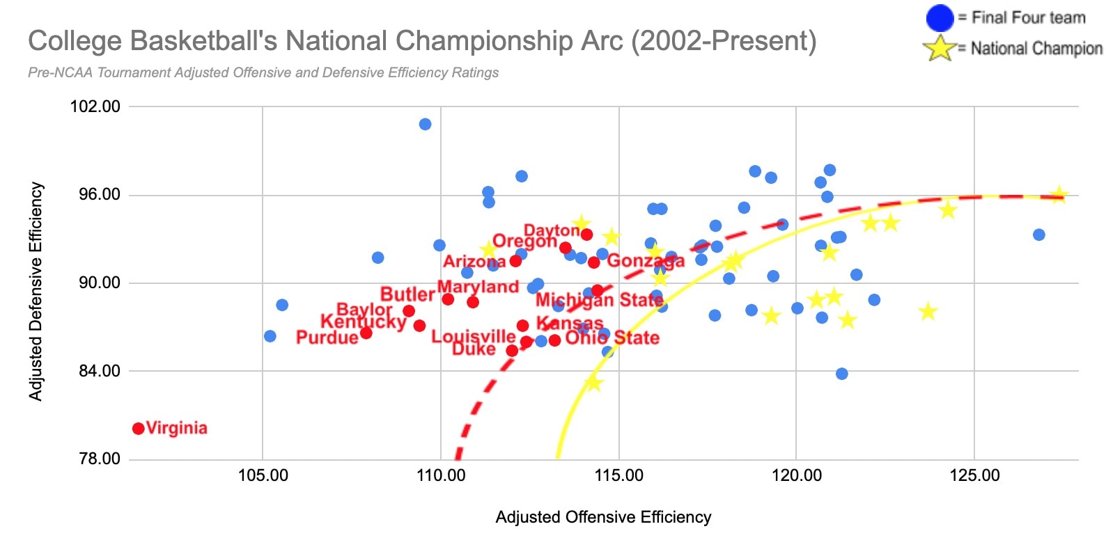 So while it's not a hard-and-fast-rule that a school's pre-NCAA tournament efficiency ratings must fall inside the arc to win a national championship, you'll find that most recent national champions fit this similar profile, which we can then use to project forward for this season.