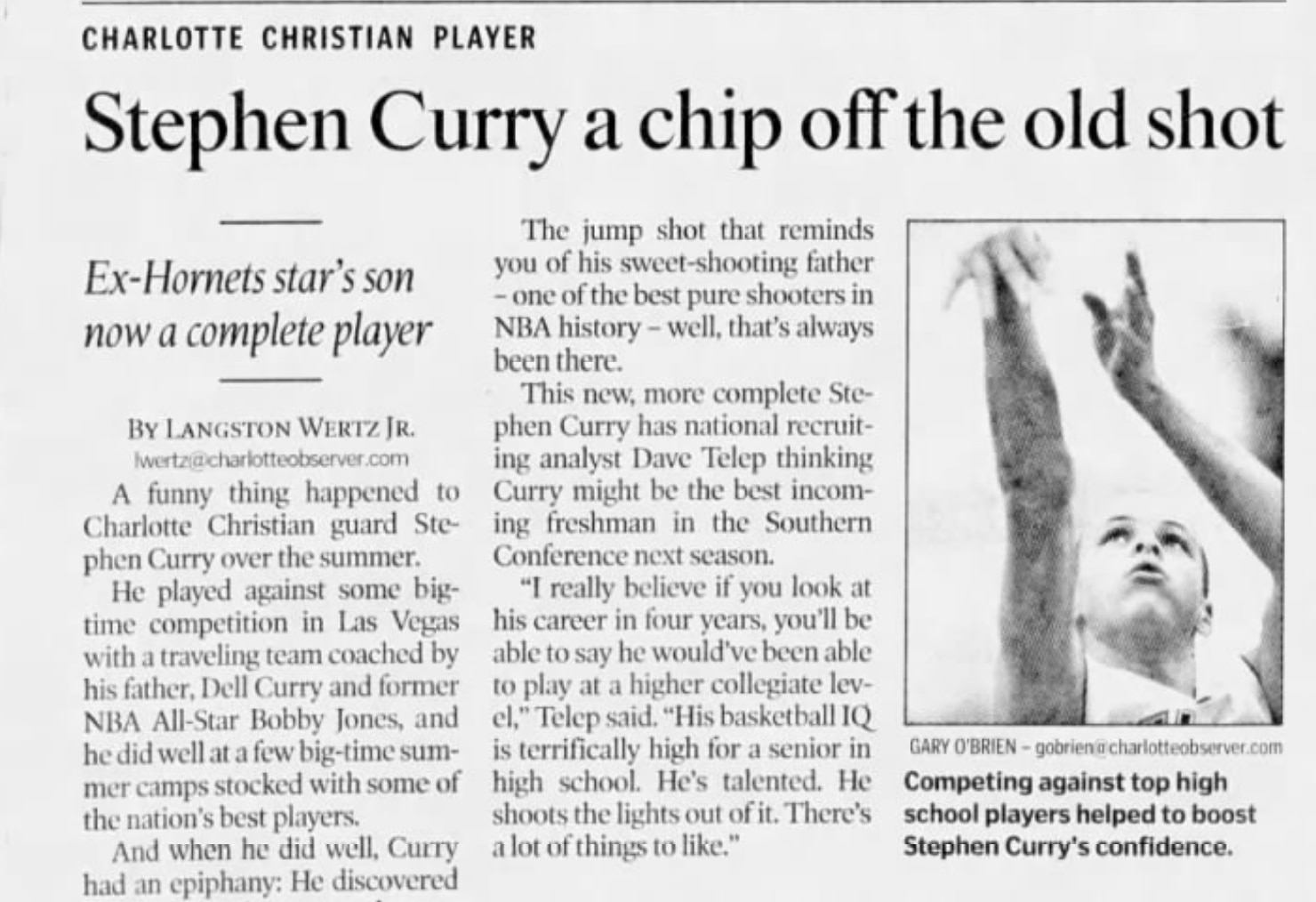 In December 2005, The Charlotte Observer wrote about Curry in a story headlined "Stephen Curry a chip off the old shot," a play on words in reference to his NBA father, with the subheadline: ""Ex-Hornets star's son now a complete player." In between his junior and senior years of high school, the younger Curry had traveled the country with his travel team (that was coached by his father), playing against top competition in Las Vegas and he also attended summer camps for top high schoolers.