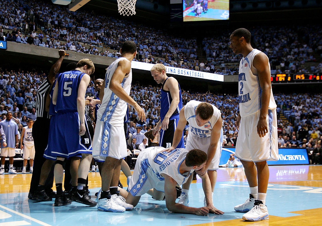 After an already physical game, then-sophomore Tyler Hansbrough was at the free throw line for UNC. After missing his shot, he went to grab his rebound. As he went up with the ball, Duke's Gerald Henderson came across and crushed Hansbrough, sending him to the ground and opening up the blood flow from his nose. Henderson was ejected because of the play.