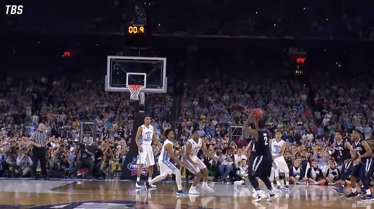 While keeping an eye on his defender, Berry, Arcidiacono broke towards the ball and caught the inbounds pass roughly parallel with the free throw line. When he caught the ball, he was parallel to the sideline and the primary TV camera angle, so that he could turn and make the most of the final 4.7 seconds of Villanova's season and his college career.