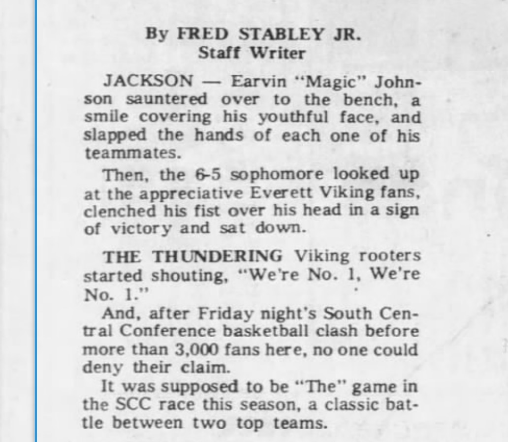 As a high school sophomore at Everett High School, Earvin Johnson was dubbed "Magic" by the Lansing State Journal's Fred Stabley Jr. after Johnson had a triple-double with 36 points, 18 rebounds and 10 assists against fellow South Central Conference contender Parkside.