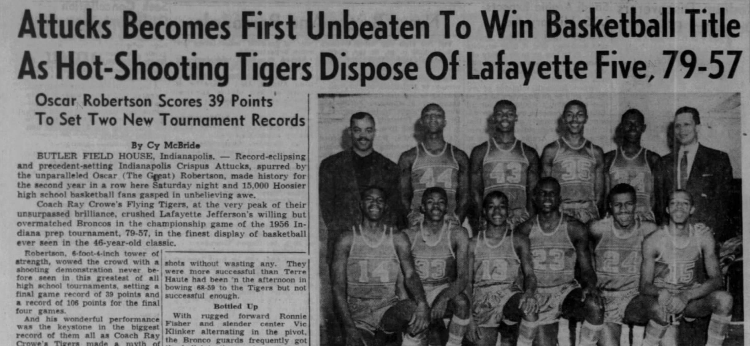"Record-eclipsing and precedent-setting Indianapolis Crispus Attucks, spurred by the unparalleled Oscar (The Great) Robertson, made history for the second year in a row here Saturday night and 15,000 Hoosier high school basketball fans gasped in unbelieving awe," wrote Cy McBride of the Palladium-Item in Richmond, Indiana, later continuing, "Robertson, 6-foot-4-inch tower of strength, wowed the crowd with a shooting demonstration never before seen in this greatest of all high school tournaments, setting a final game record of 39 points and a record of 106 points for the final four games."