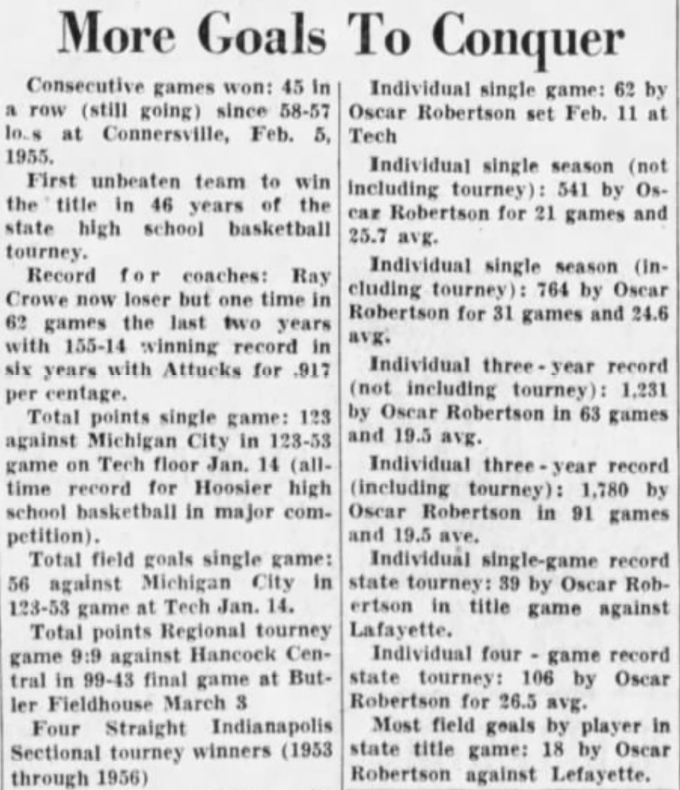 "All of the individual records broken went to the incomparable Oscar Robertson, generally regarded in most corners the finest player in all-time Hoosier high school basketball," wrote Bob Williams of The Indianapolis Star.