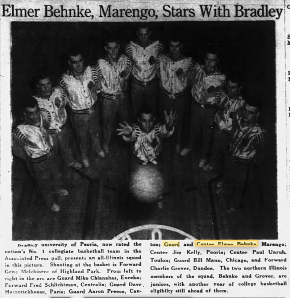 As it turns out, according to the Marengo Republican-News, another Illinois-based newspaper, Behnke was listed as both a guard and a center, but not a forward. That's him in the middle of the picture below โ the tallest player on the team.