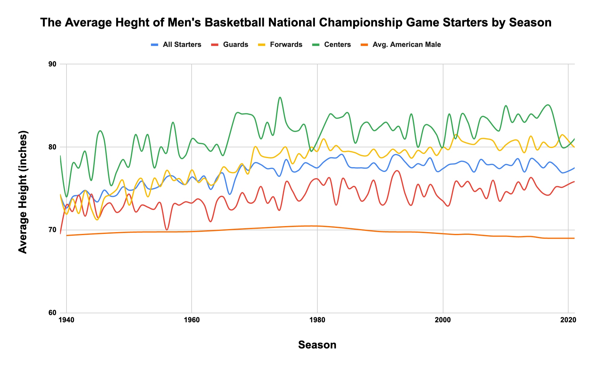 Here's how the average height of men's basketball national championship game starters, guards, forwards and centers compare to the average height of American males. Of course, not every player who has played in the national championship game has been American, but the vast majority have been.