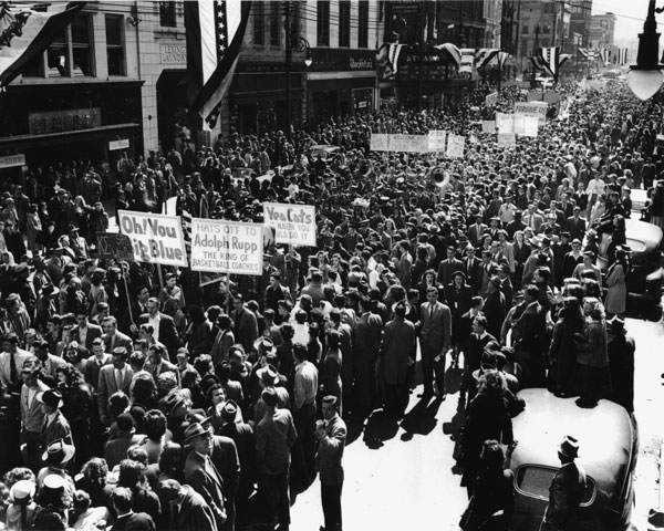 Fans celebrate UK's championship with a street parade. Kentucky defeated Baylor 58-42.