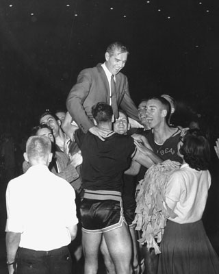 George Kaftan of Holy Cross is carried off the court after defeating Oklahoma, 58-47, for the title.