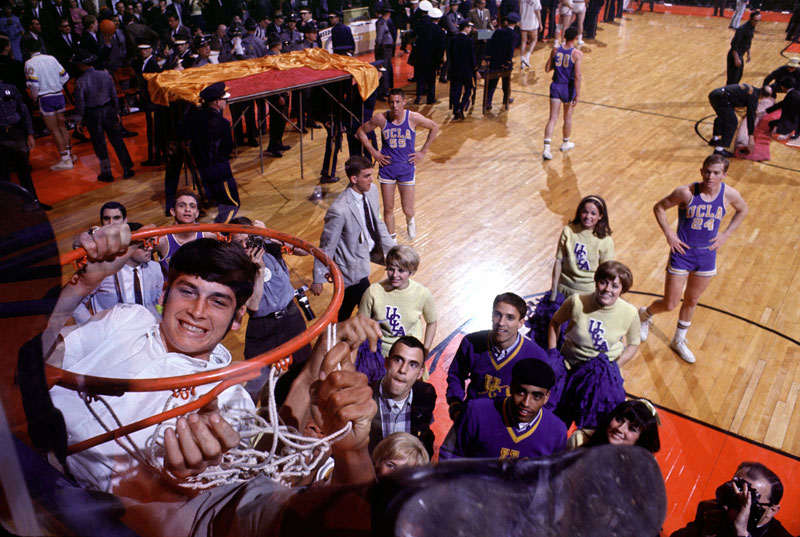 UCLA's Gail Goodrich (center) and teammates run on to the court after the victory.