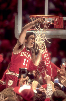 Keith Smart (23) of Indiana puts up a shot past Rony Seikaly (4) of Syracuse.