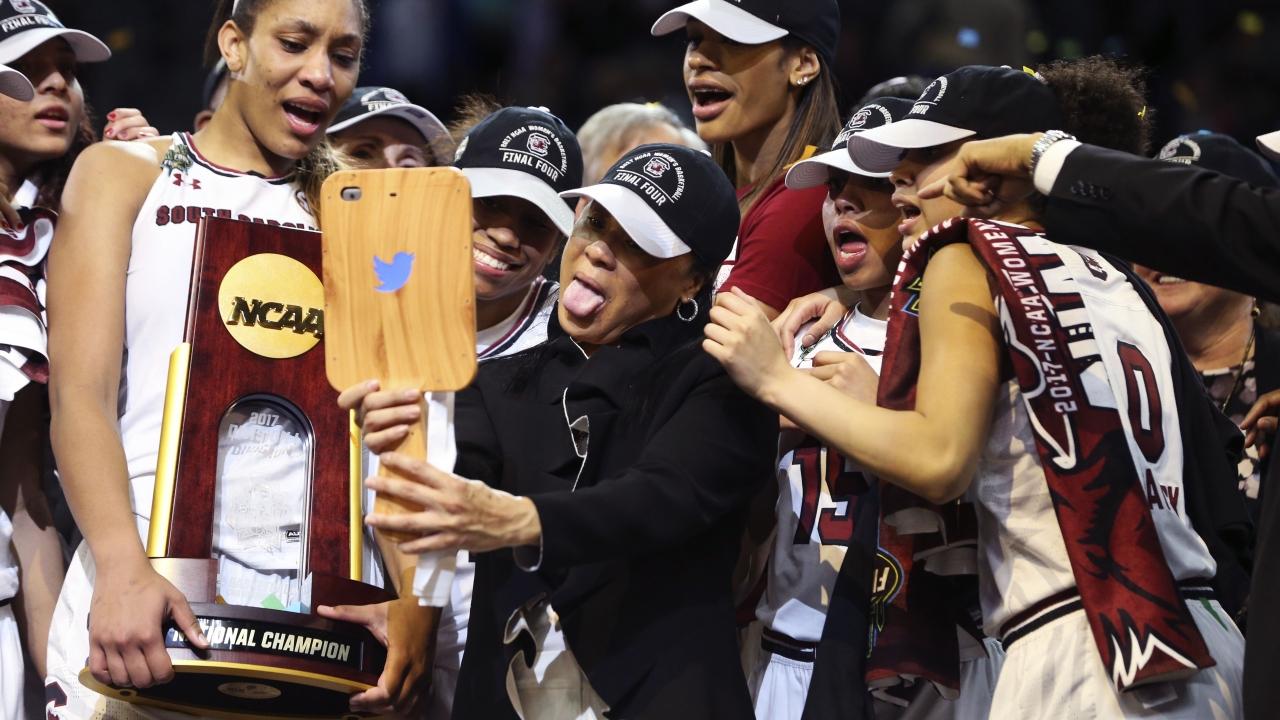 South Carolina head coach Dawn Staley celebrates with her players after Sunday's win in the title game.