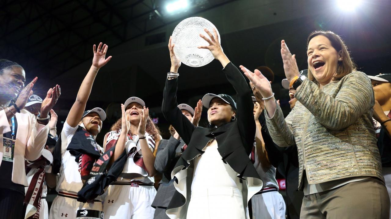 South Carolina head coach Dawn Staley celebrates with the championship trophy after Sunday's win.