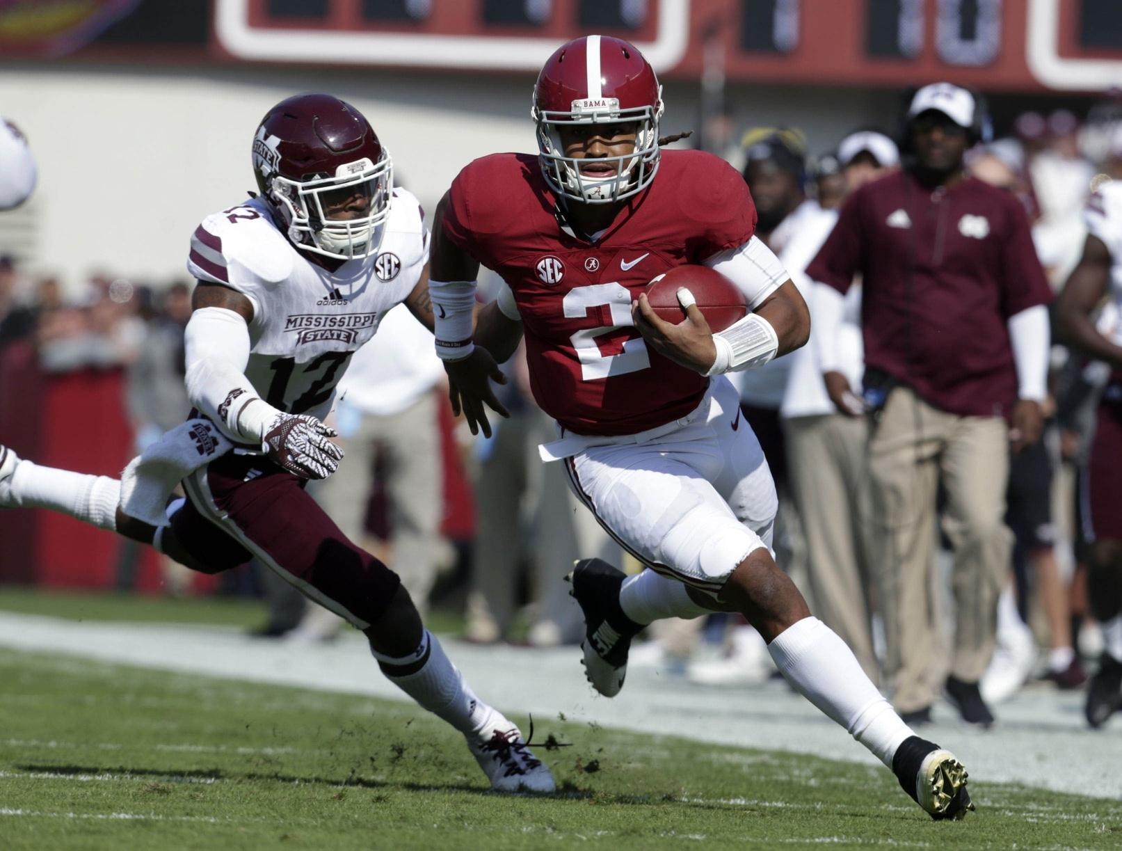 For all the dominance and defensive recognition Alabama has earned this year, huge offensive performances have been few and far in between for the Tide. That changed in Week 11 with the freshman Hurts leading a 51-point offensive explosion against Mississippi State, the Tide’s highest total since dropping 52 in Week 1. Hurts did it both through the air and on the ground on Saturday. He completed 28 of 37 passes for 347 yards and four touchdowns, with just a single interception standing as a blemish. But he made up for that with his legs, carrying the ball 11 times for a cool 100 yards, including a 60-yard breakaway, and an additional score.