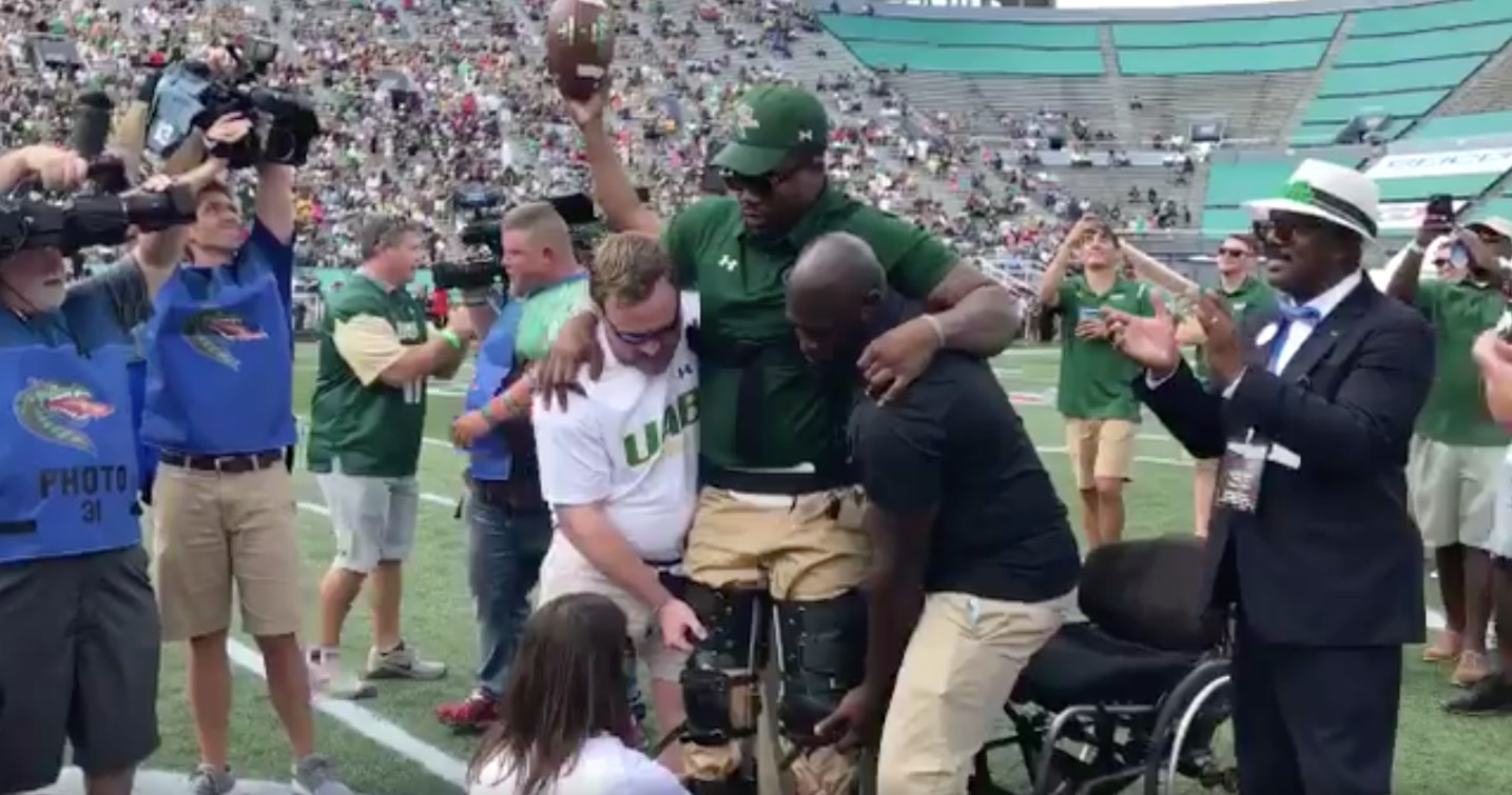 Timothy Alexander promised he would walk out on the field when the UAB football team returned. Saturday marked the return of the Blazers, and Alexander – a 2015 UAB grad and the team's director of character development – held up his promise, presenting the game ball after getting out of his wheelchair and walking to midfield with some assistance.