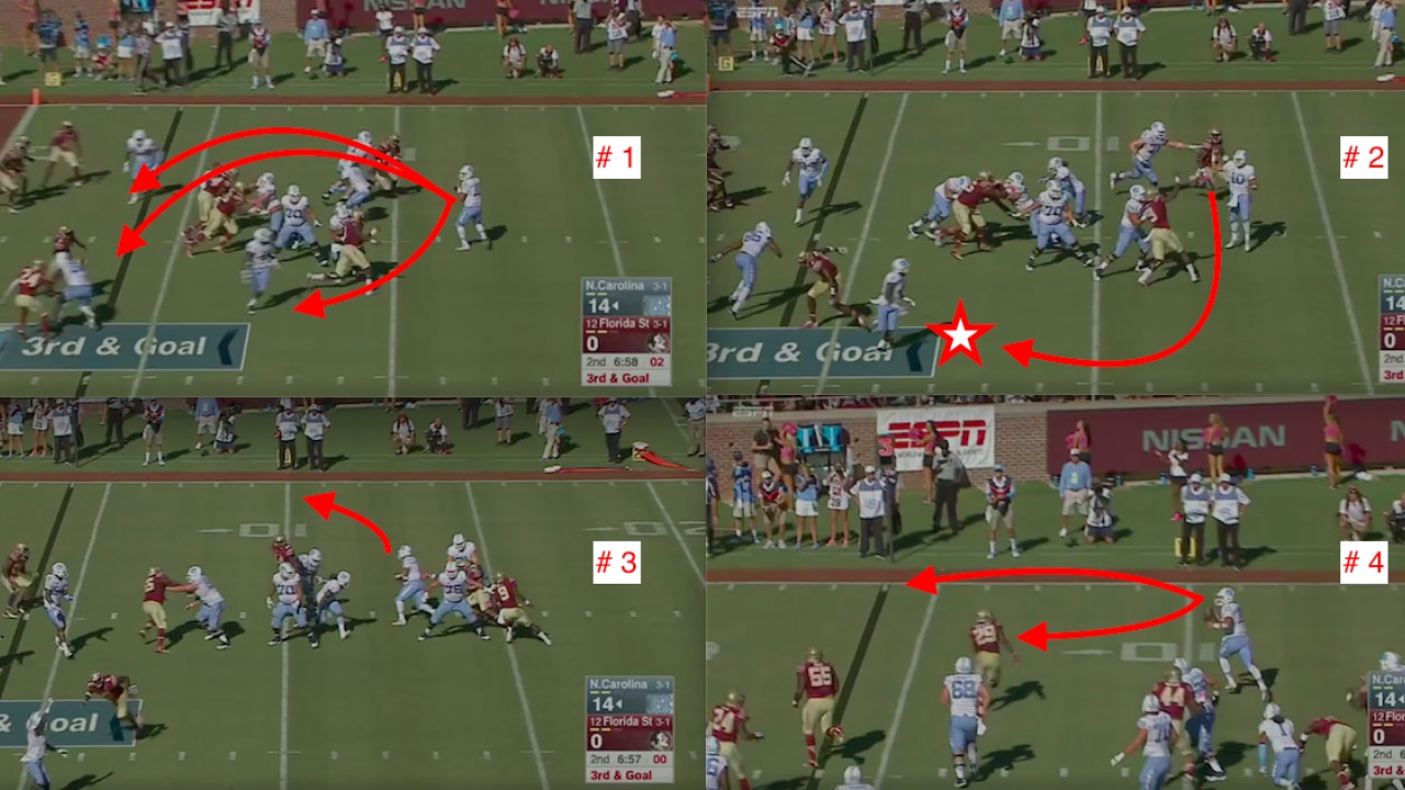 With one man left before the endzone, Trubisky pulls out yet another pump fake to create the hesitation he needs to get around the defense. The key to this play — given Trubisky's deficit in the athleticism department (sorry Mitch, no offense) —is his decision to keep his eyes downfield. Florida State's defense must continue to honor the pass here, and ultimately the Seminoles are just a victim of a quarterback with a solid football IQ.
