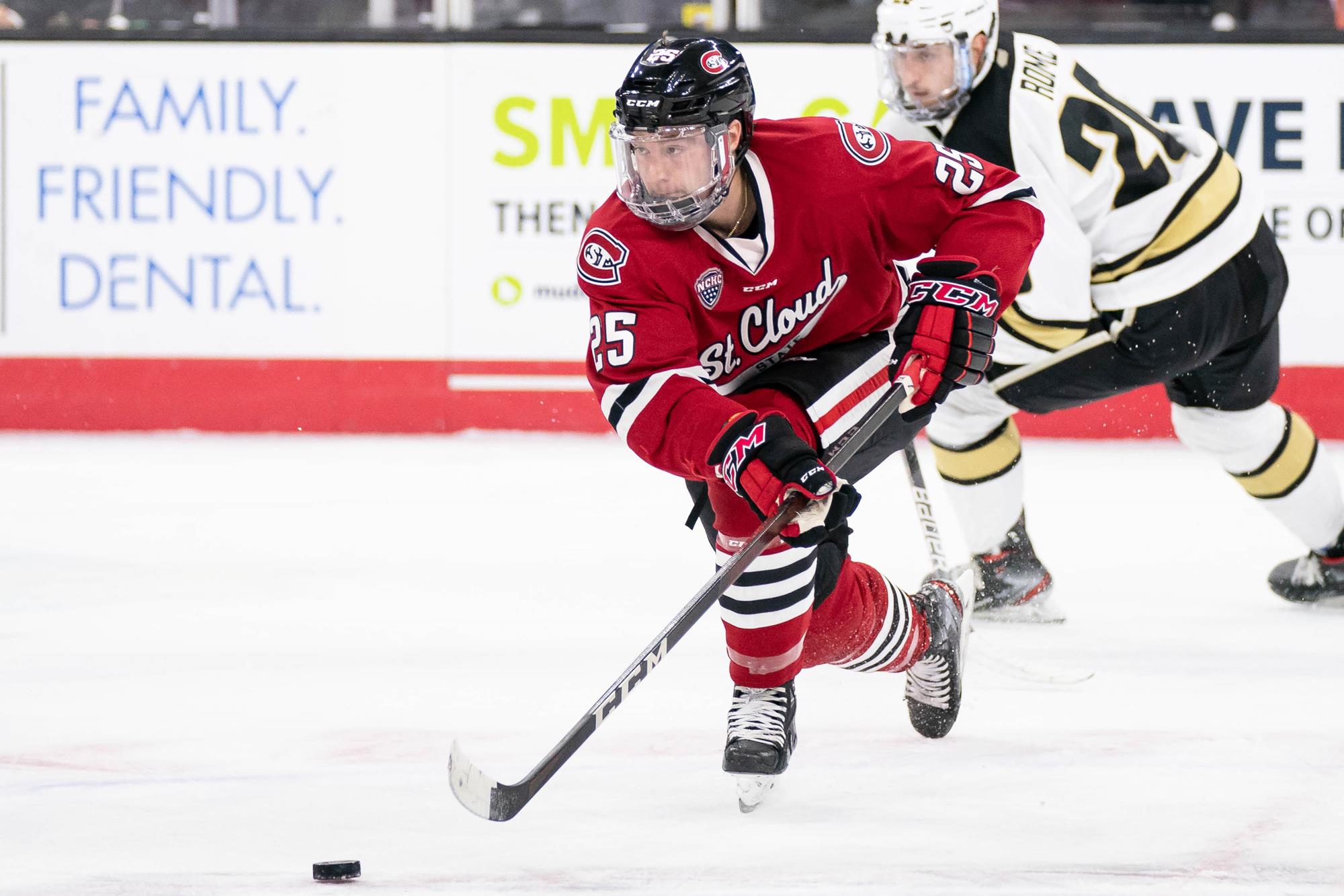 - Sam Hentges (St. Cloud State): Despite missing some time this season due to injury, Hentges has nine points in seven games. The New Brighton, Minnesota native posted four points over two games against Bemijdi State in his first weekend back from both upper and lower body injuries. As a freshman in 2018-19, he was a major contributor on the Huskies, posting 20 points. He followed that up in 2019-20 with 24 points. In 29 games last season, he posted 17 points and helped guide St. Cloud State all the way to the national championship game. He was drafted in the seventh round by the Minnesota Wild in 2018.